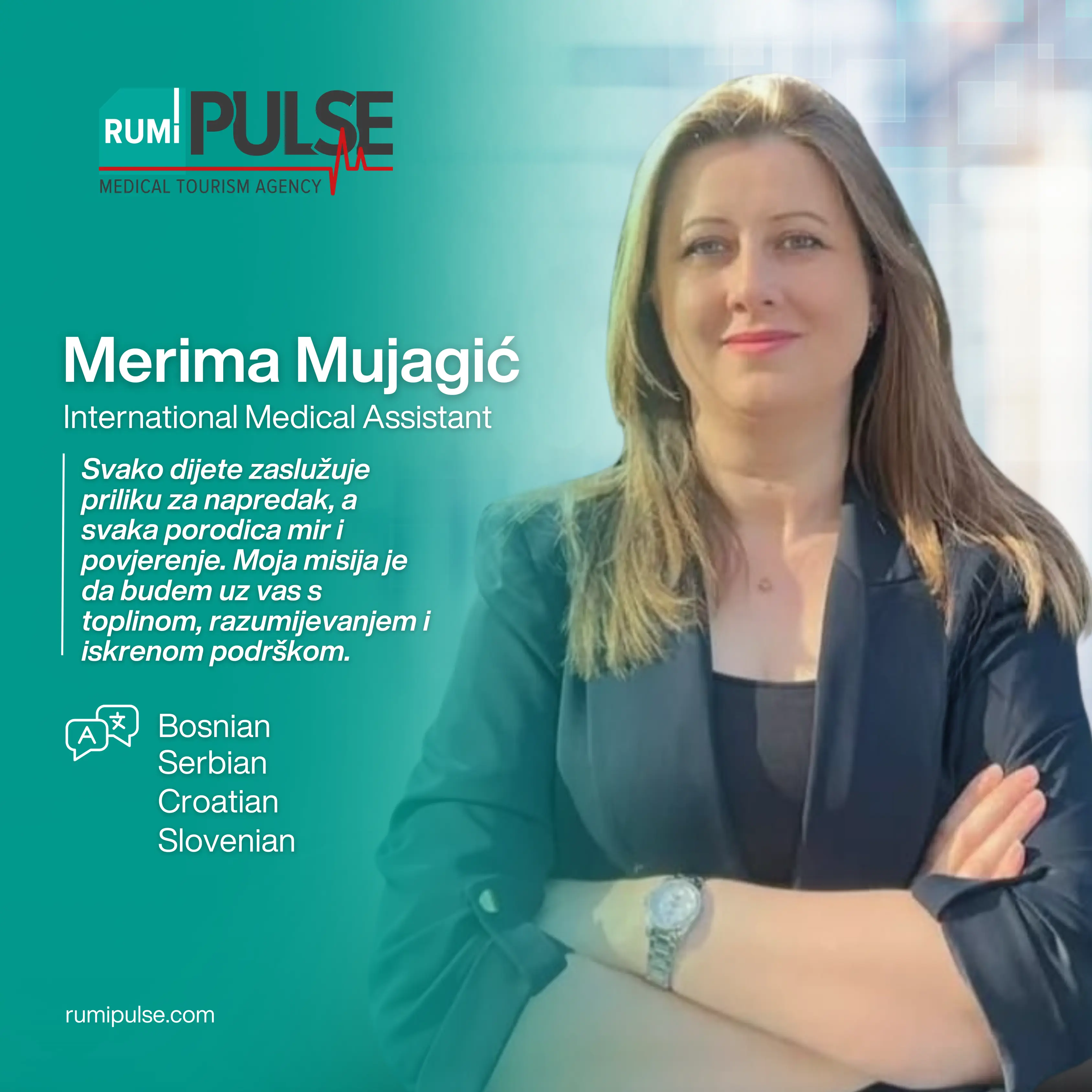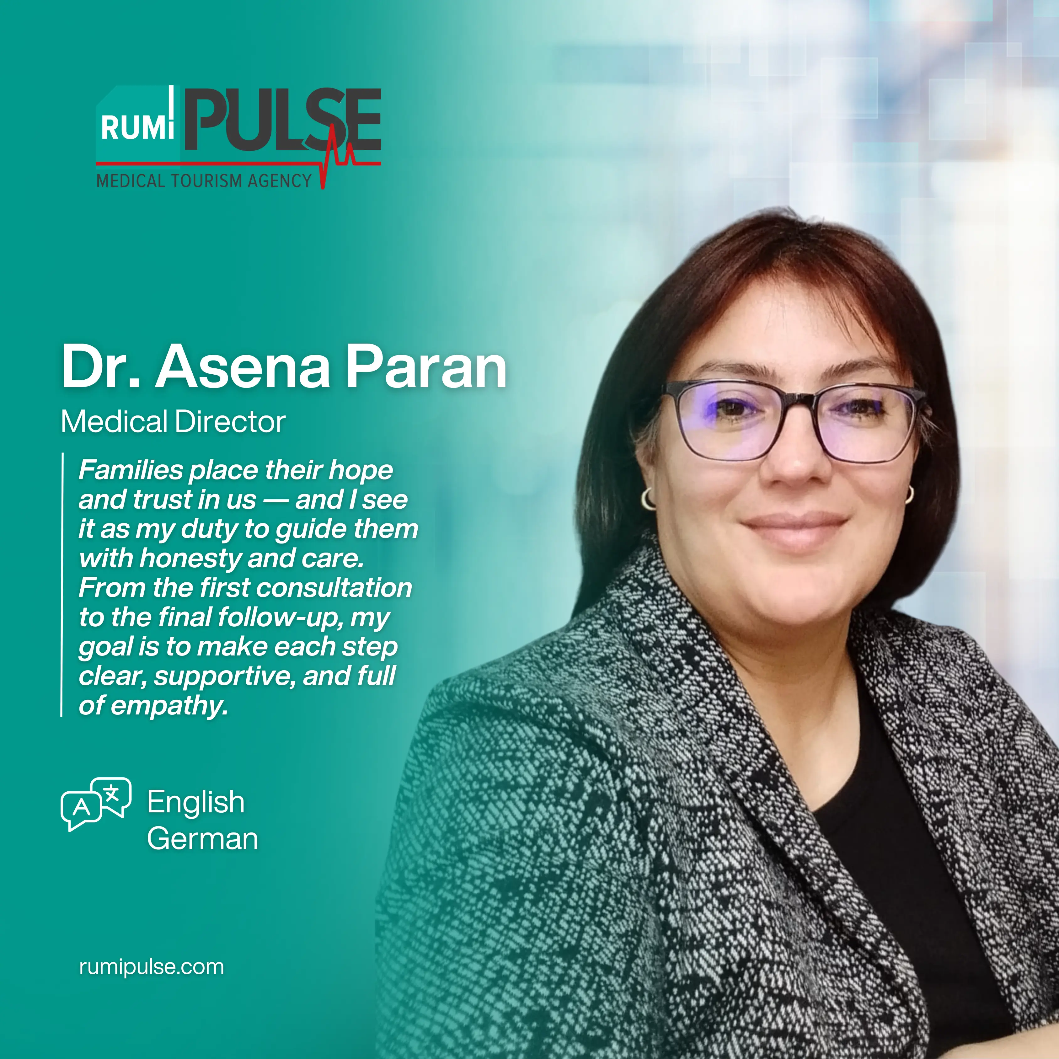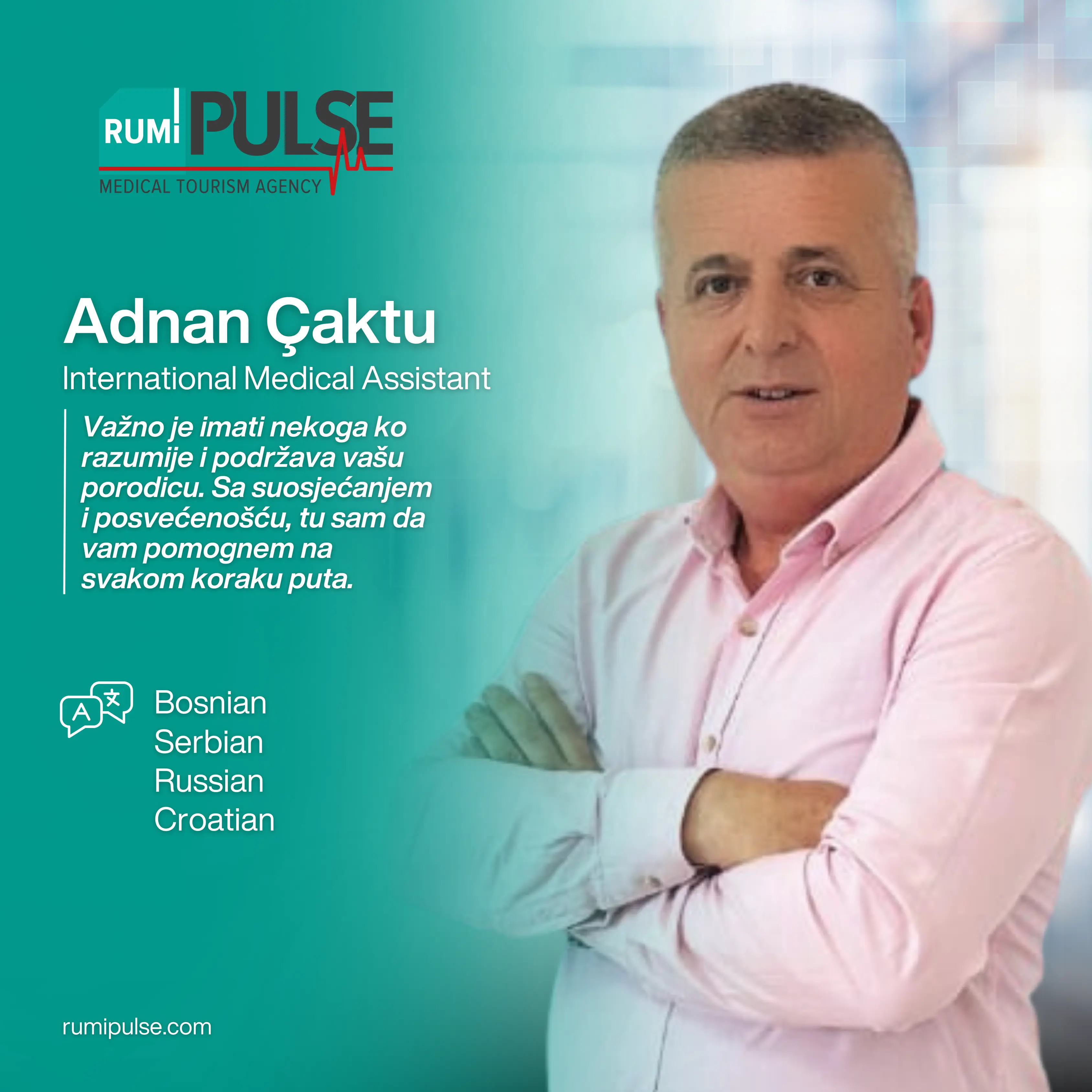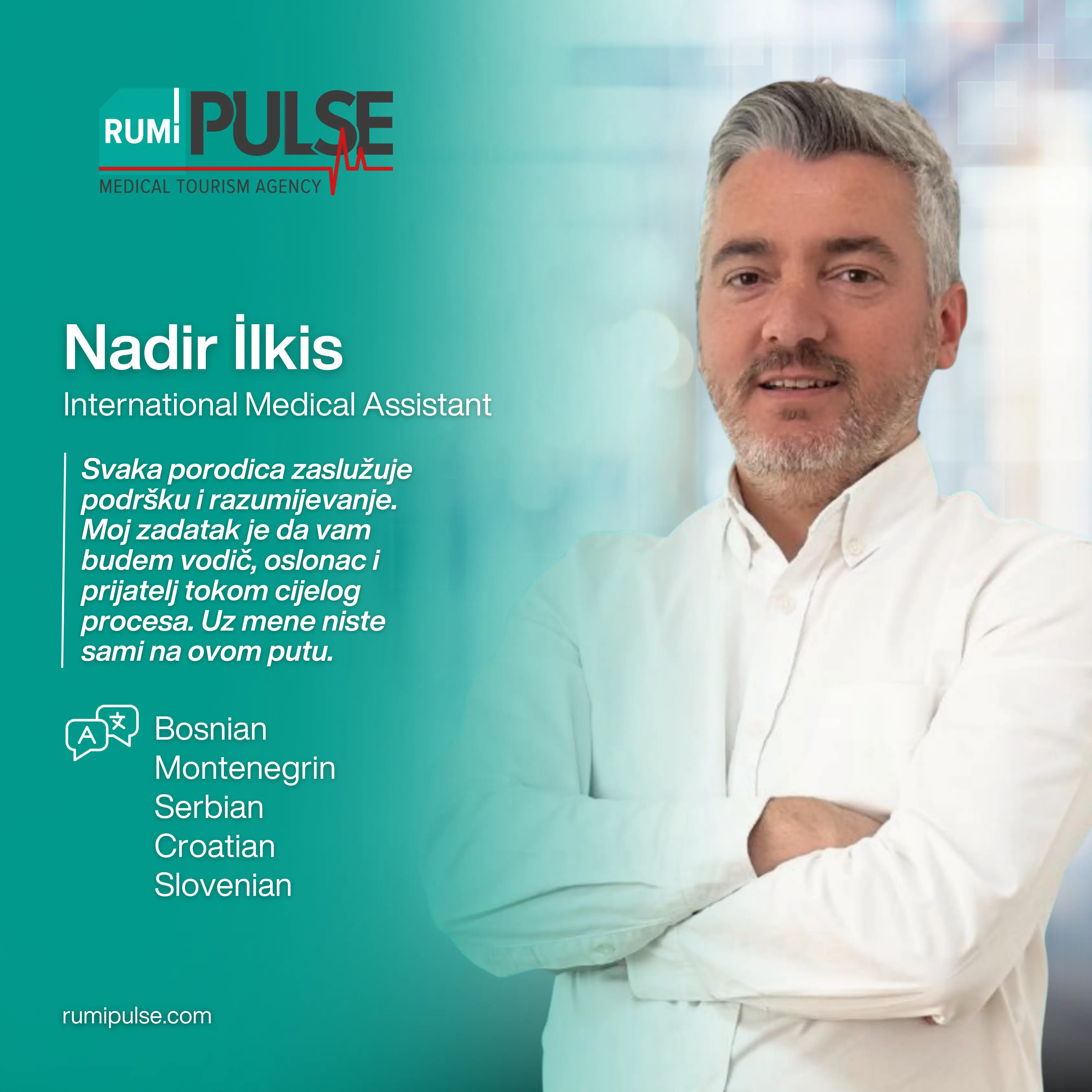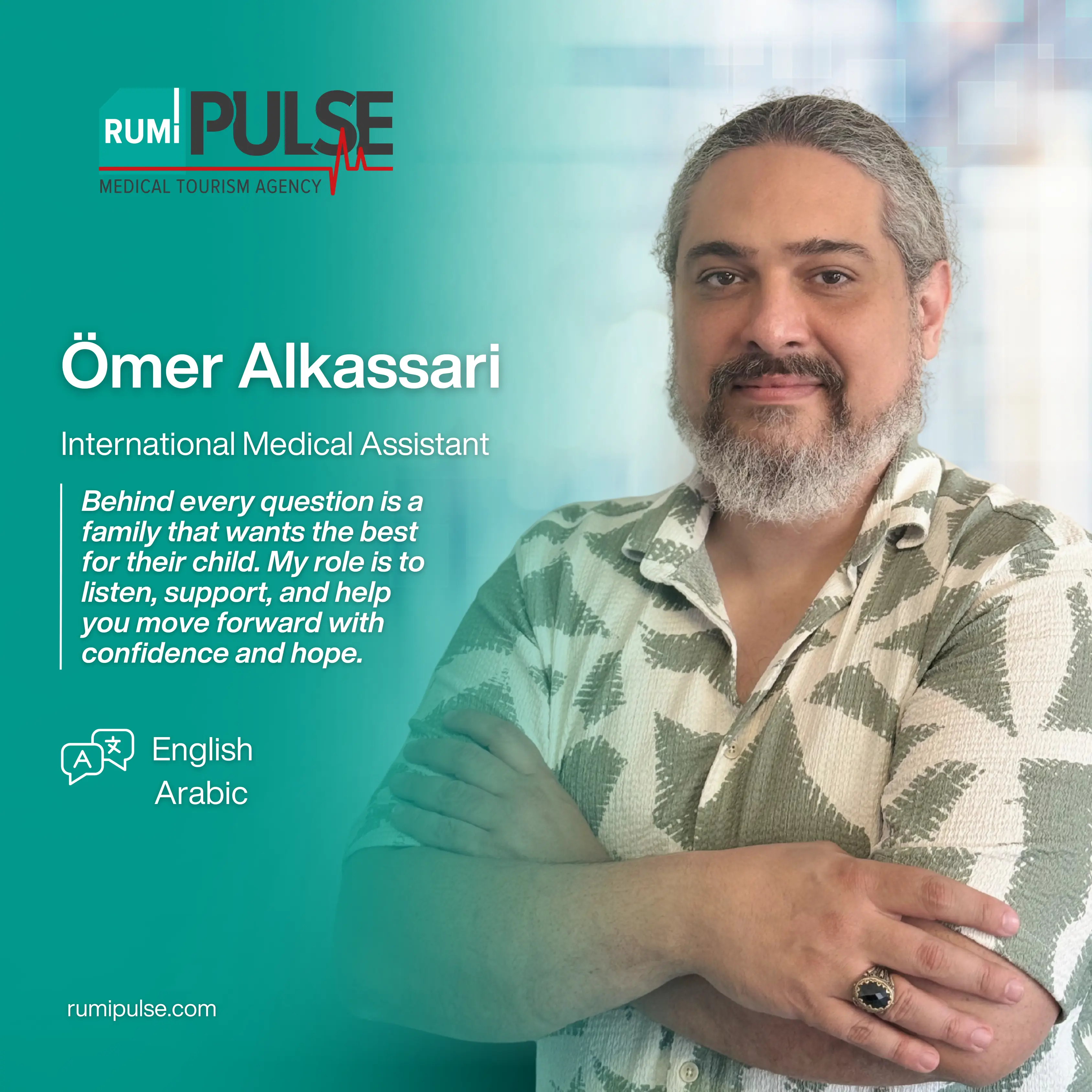 Kombinujući naše dugogodišnje iskustvo u turizmu sa stručnim timom za medicinski turizam, s ponosom našim pacijentima pružamo besprijekorno i udobno iskustvo od početka do kraja. Rumi Pulse pažljivo planira i upravlja svakim korakom puta ozdravljenja – uključujući putovanje, smještaj, koordinaciju s bolnicom i termine kod doktora – osiguravajući sigurnost i spokoj. U Turskoj pružamo personalizirana rješenja u oblasti terapije matičnim ćelijama, regenerativne medicine, ortopedije, neurološke rehabilitacije i neplodnosti, s ciljem poboljšanja kvaliteta života svake osobe. S nama je vaš put ozdravljenja organiziran pod jednim krovom, uz profesionalnu podršku i empatičan pristup.