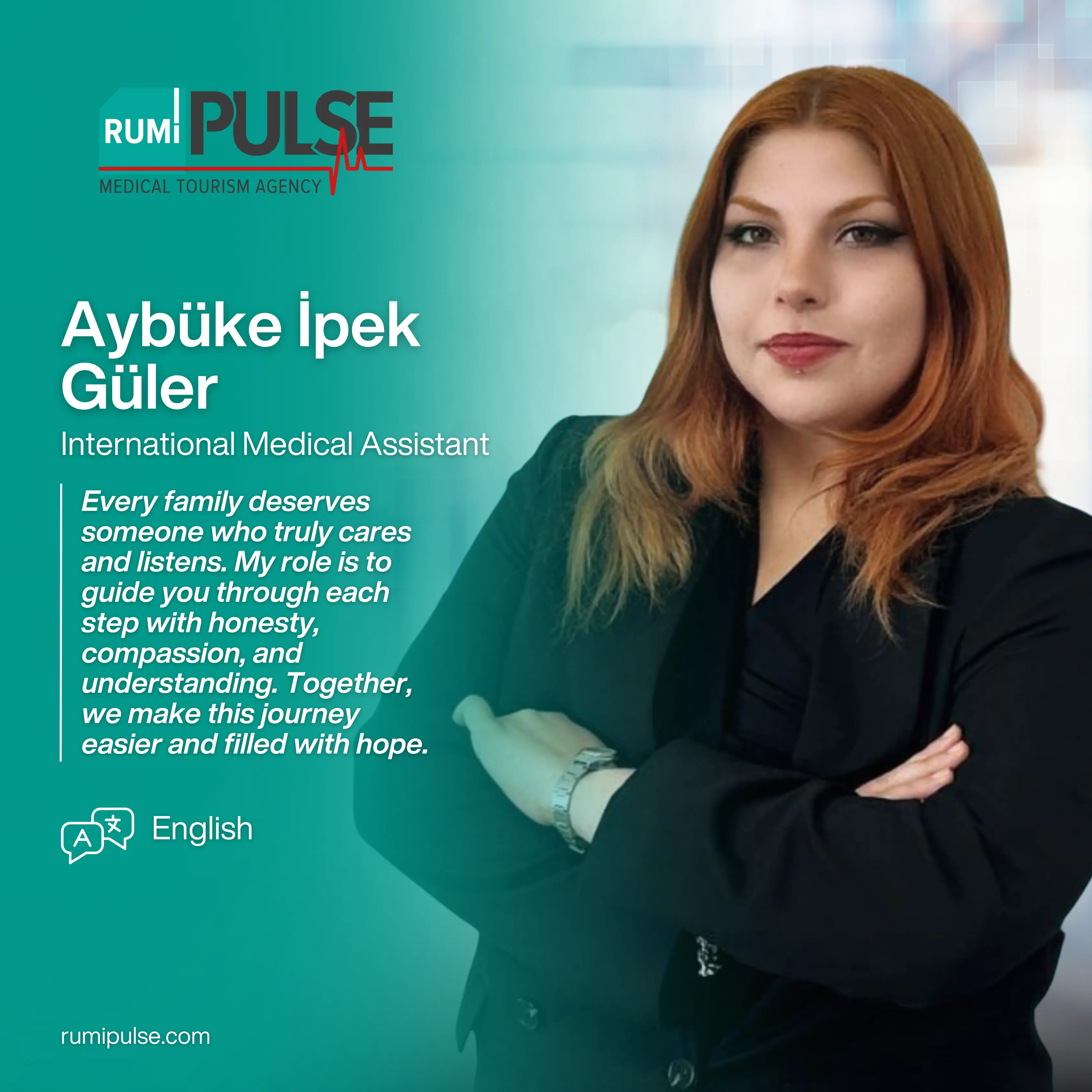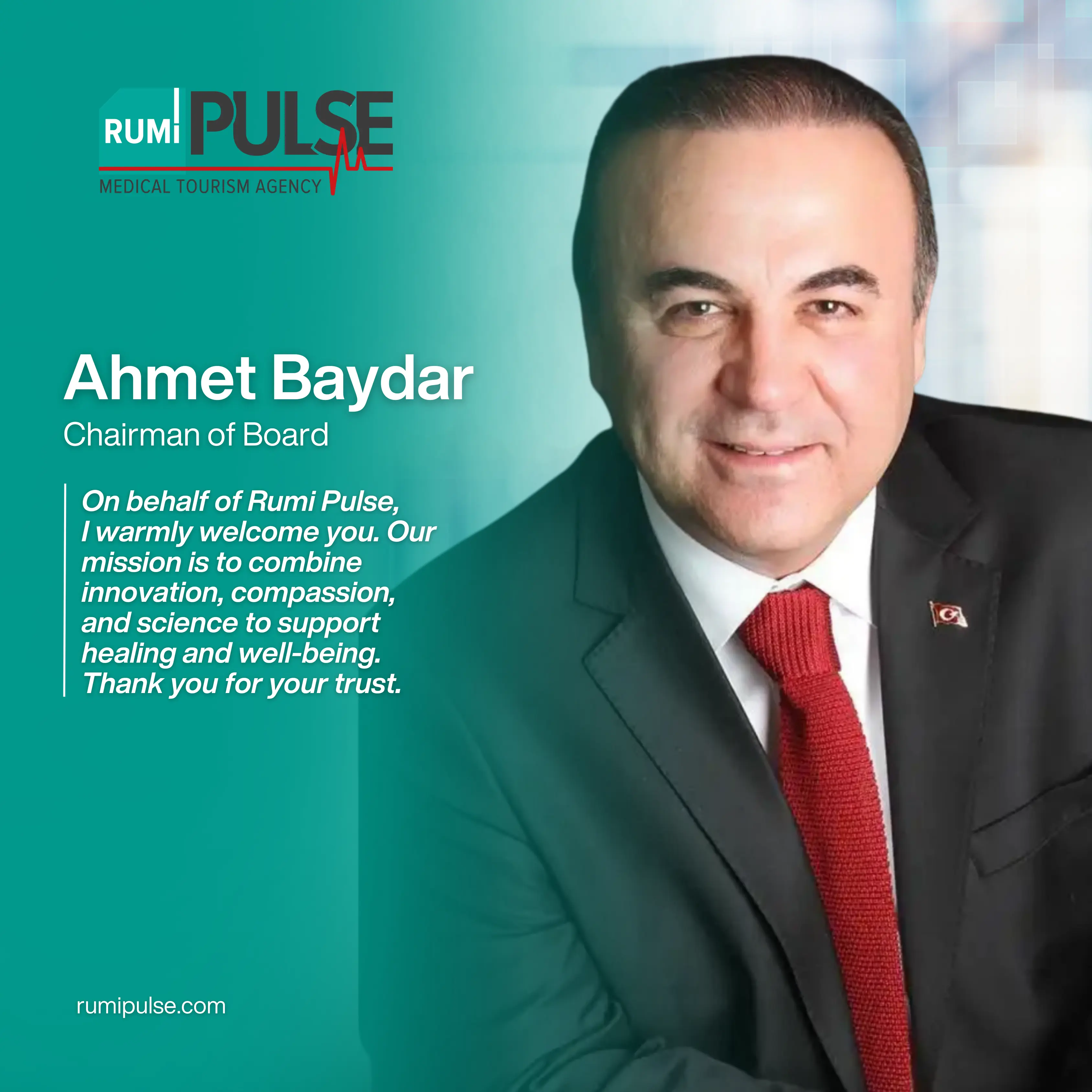 Rumi Pulse je prvi predstavnik medicinskog turizma u Konji kao jedna od kompanija ABK Holdinga, uglednog holdinga naše zemlje. RumiPulse pruža međunarodne zdravstvene usluge sa profesionalnim timom i predstavlja vrhunske zdravstvene usluge u Turskoj. S pravom smo ponosni što smo dugogodišnje iskustvo u turizmu spojili sa profesionalnim stručnjacima za medicinski turizam koje smo uključili u naš tim. RumiPulse pruža sve usluge potrebne za zdravstvenu njegu, kao što su putovanje, smještaj, bolnica i termini kod doktora.